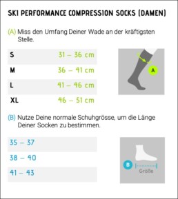 Die Kompressionsstrümpfe sitzen passgenau auf der Haut und wirken dadurch optimal. Für die Auswahl der richtigen Größe sind die Schuhgröße und der Wadenumfang an der dicksten Stelle zu bestimmen. Die Skisocken mit Kompression in sportlichem Design sind langlebig, atmungsaktiv und bei 40°C waschbar. Sie werden eigens unter höchsten Qualitätsstandards in Deutschland gefertigt, sind schadstofffrei und hautverträglich.
